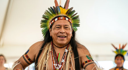 Profile of indigenous man adorned with vibrant feathered headdress, symbolizing heritage