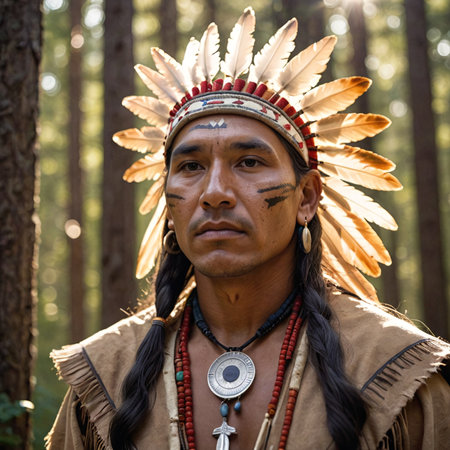 Indigenous chief wearing traditional headdress and clothing contemplates the future of his people. Ai generated image