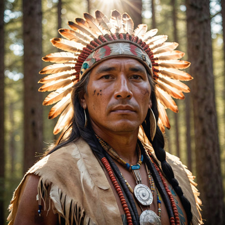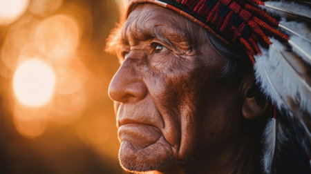 An elderly Native American man stands proud, adorned in a traditional headdress, gazing thoughtfully into the distance as sunlight casts a warm glow, highlighting his features and cultural heritage.