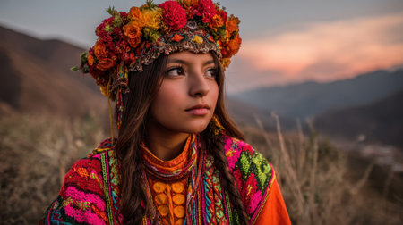 This portrait features a young woman adorned in vibrant traditional attire, surrounded by natural beauty. The scene captures the essence of cultural identity and serene elegance at sunset.