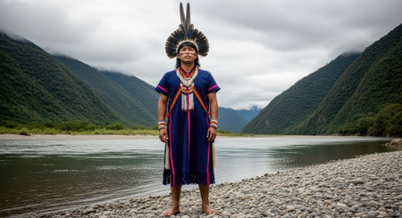Indigenous male in traditional attire by riverbank in mountainous landscape
