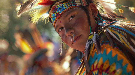 The close up picture of the native american teenage is wearing the costume of traditional dancer with blur background, the traditional dancer require cultural knowledge and dancing technique. AIG43.