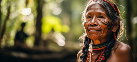 Elderly indigenous woman with traditional facial markings, contemplative gaze in the forest