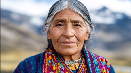 Indigenous elderly woman smiling wearing traditional textile clothing with mountains in background