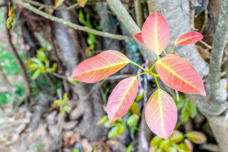 The leaves pink color of the Bodhi Tree in the summertime with the sunlight in midday.