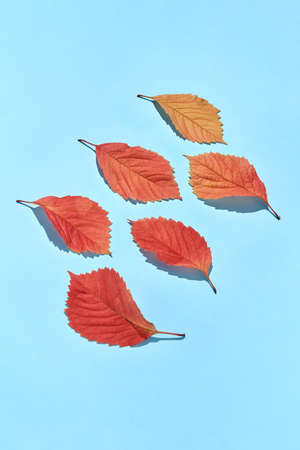 A group of autumnal and fall leaves over a clear blue background with copy space