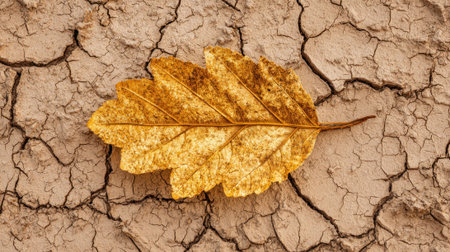 A golden leaf lies on dried, cracked earth, showing the vibrant colors of autumn and the changes in nature as seasons shift. The contrast highlights both beauty and decay.