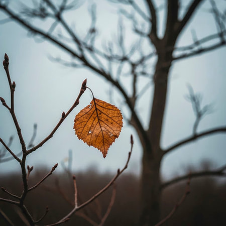 The last leaf is held on the branch of an autumn tree