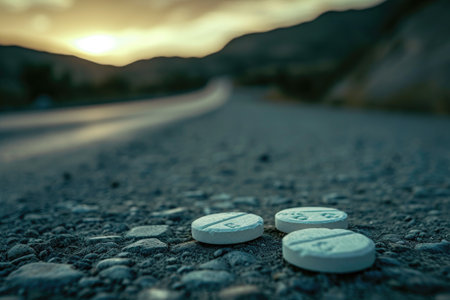 Two white pills are seen lying on the side of a road, creating an intriguing scene, Visual narrative of the journey through opioid addiction recovery, AI Generated