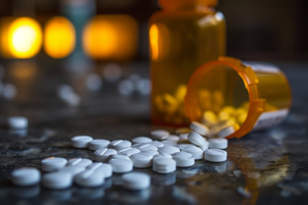 White oblong prescription pills spilled from an orange pharmacy bottle onto a reflective dark granite countertop. concepts include addiction, overdose, pain relief, and misuse of medication.