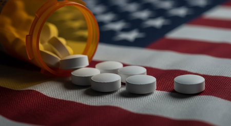 Numerous pills spill out of an open bottle, scattering across a table, The contrast between the beauty and danger of opioids, AI Generated