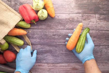 hand in gloves taking vegetable out from a reusable bag vegetables top view