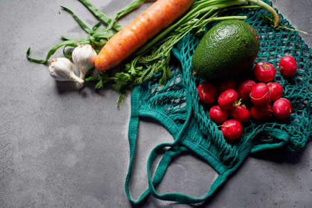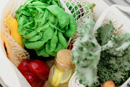 Flat lay Mesh grocery shopping eco friendly bag with vegetable and greens, Zero waste cconcept, Local farmers market, shopping mall, top view, copy space, Plastic free items.