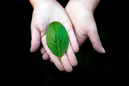 image of children hand leaf dark background