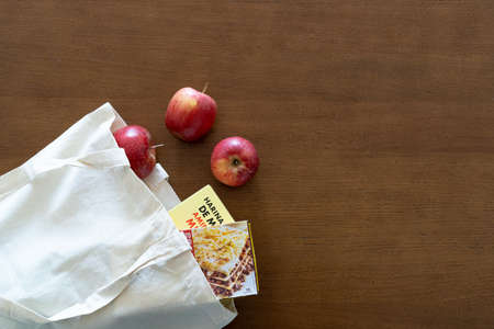 Cloth bag with apples and boxes on the table