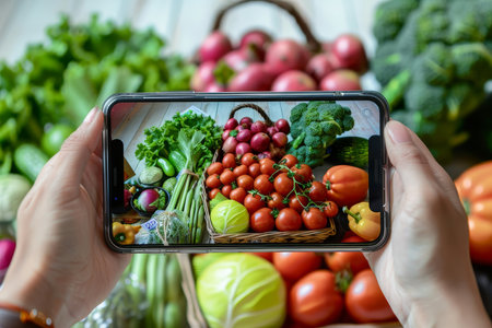 A hand in a glove holds a smartphone taking a picture of fresh organic vegetables inside a supermarket fridge, showcasing vibrant colors and promoting healthy eating choices.