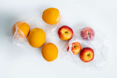 Fresh ripe oranges, apples in transparent plastic bags on a white background. Top view, flat lay.