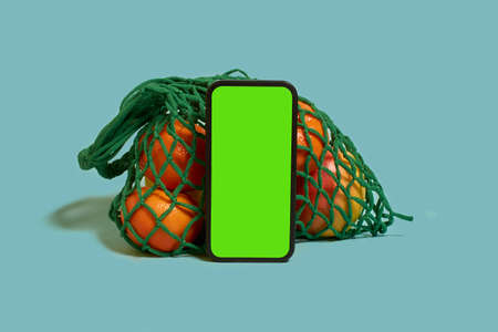 online shopping. A smartphone with a green screen and fruits and citrus in a mesh bag on a blue background. Template