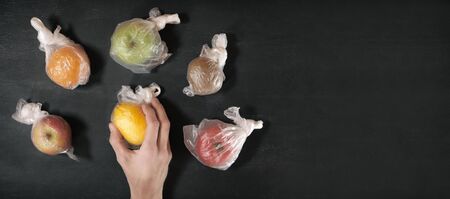 Hand select fresh yellow lemon in individual plastic package on black