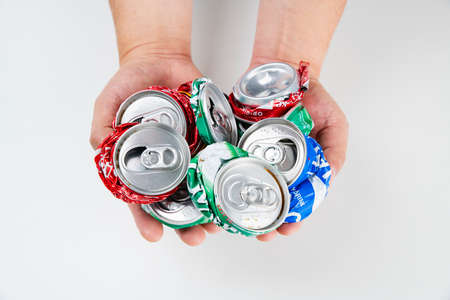 Budapest, Hungary - October 10, 2019: Recycled aluminum beverage cans of various drink brands screwed to wall. Garbage recycling concept