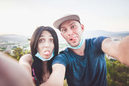 Boyfriend and girlfriend crazy faces close up while take a selfie on vacation with panoramic view of mountains in background. Wanderlust life style and city sightseeing vacation in caucasus.Tbilisi.