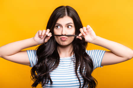 brunette woman with curls making fake mustache from hair isolated on yellow