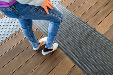 Man standing at the tactile paving for blind handicap. Yellow tactile paving for the visually impaired on the sidewalk.