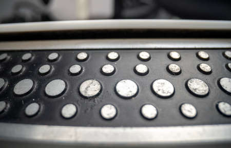 A close-up view of a textured metal surface featuring a diamond pattern, showing signs of wear and grime, conveying a sense of industrial use and ruggedness.