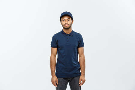 Delivery Concept - Handsome African American delivery man. Isolated on Grey studio Background. Copy Space.