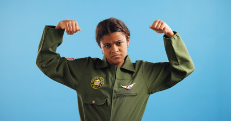 Soldier, kid and girl with portrait, flexing arms and uniform with doubt on blue studio background. Face, mockup space and model with career day, serious and strong with power and fighter pilot