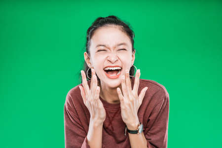 close up young Asian woman expressing wide-open mouth and raising hands in amazement isolated on green background