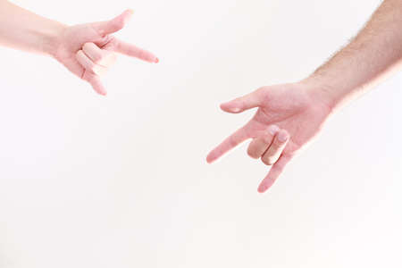 a man hands doing rock symbol wear rock style carmine T-shirt