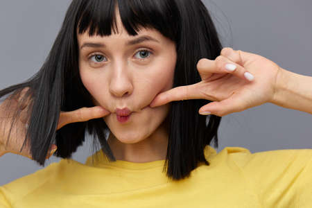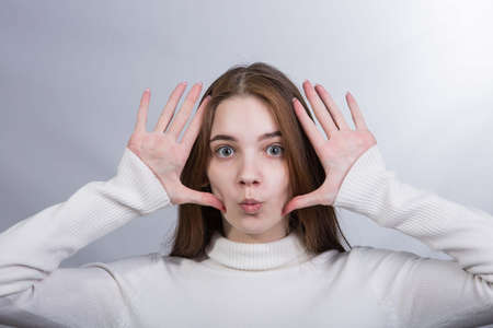 a funny, playful, emotional woman makes a funny face by pursing her lips and holding her fingers on her cheeks. Horizontal photo