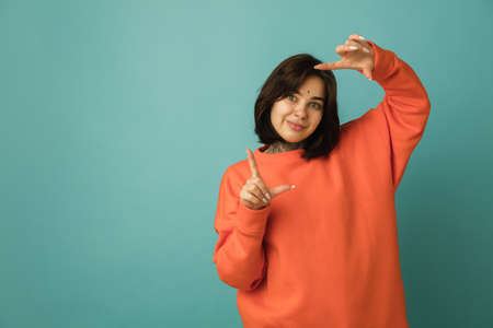 Framing, selfie. Caucasian womans portrait isolated on blue background with copyspace. Beautiful female model in orange hoodie. Concept of human emotions, facial expression, sales, ad, fashion.