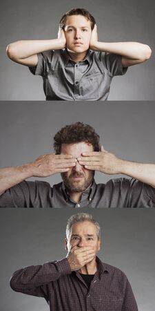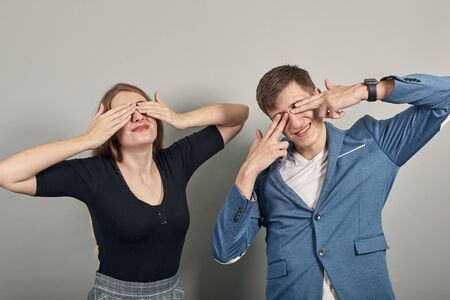 Closing face palms covers eyes visible through with hands. Young attractive couple boyfriend girlfriend two people, dressed black t-shirt, blue jacket, grey background
