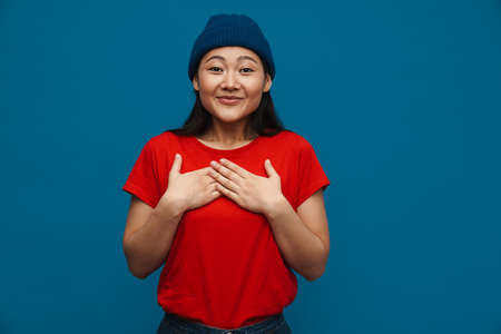 Portrait of a happy excited casual young asian woman wearing hat standing over blue wall background holding hands at chest