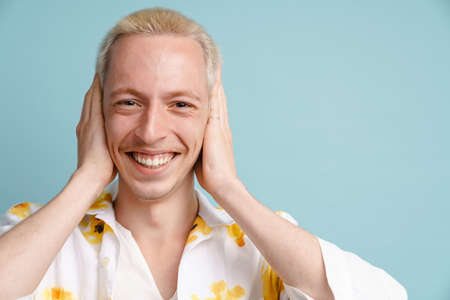 Young blonde man in shirt smiling and covering his ears isolated over blue background
