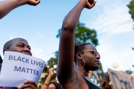 Barcelona, spain - 1 june 2020: Black lives matter movement march in demanding end of police brutality and racism against african-americans and people of color after the killing of George Floyd, chanting and holding banners