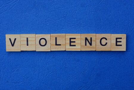 word violence made of brown wooden letters on a blue table