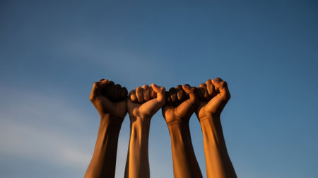 A powerful display of solidarity is captured as diverse hands, both light and dark, raise their fists against a serene blue sky. This striking image symbolizes strength, unity, and the collective spirit of resilience among different communities.