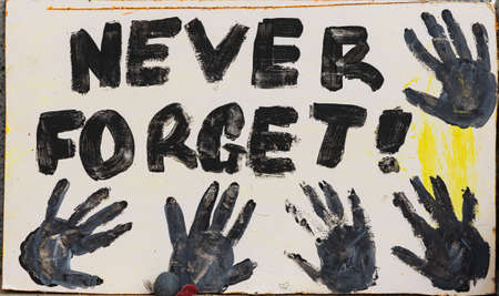 Vancouver BC, Canada-August 15, 2021. A sign never forget is on display on the steps at the memorial for the mourning of the First Nation Kids. Honoring the victims of Canadian residential schools