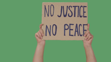 Hands of men raising up cardboard poster NO JUSTICE NO PEACE. Stop Racism concept, No Racism. Rallies against racism and police brutality. Peaceful life of blacks matters. Isolated green screen.