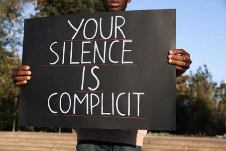 African American man holding sign with phrase Your Silence Is Complicit outdoors, closeup. Racism concept