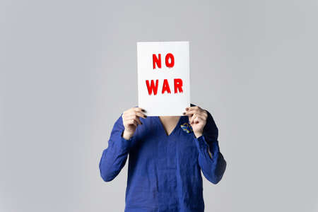sheet of craft paper with red color inscription no war. Upset poor girl homeless protesting war conflict raises banner with inscription message text No War. Crisis, peace, stop aggression.