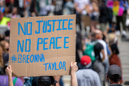 BOISE, IDAHO - MARCH 31, 2020: sign stating no justice no peace at the boise capital