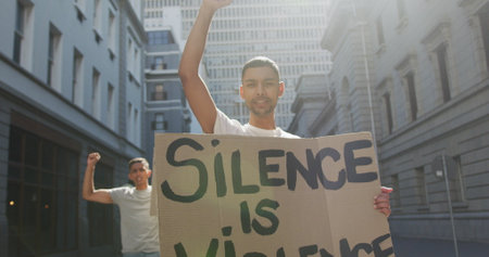 Two biracial men on a protest march holding placards raising hands. equal rights and justice protestors on demonstration march.