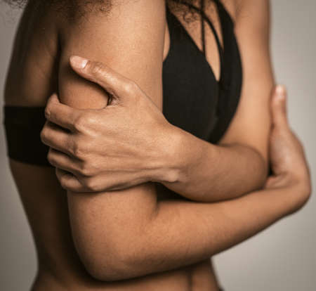 Close up. Timidity, panic attack, self-preservation, fear African American girl standing covered with hands in black bare shoulder top isolated on grey background. Human emotions.