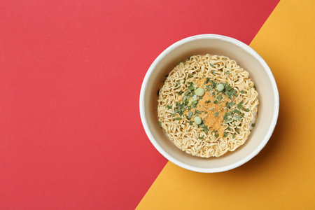 Cup of instant noodles on color background, top view. Space for text