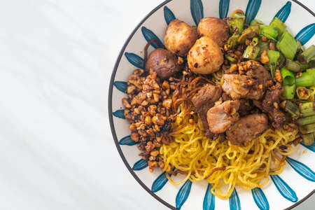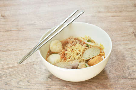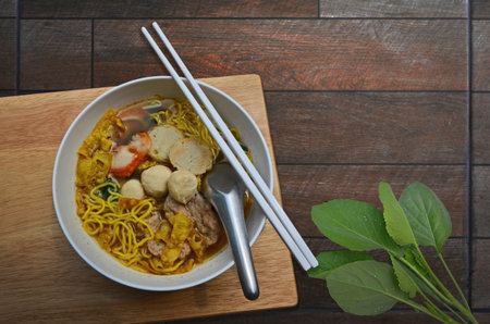egg yellow noodles noodles topping slice boiled pork and ball in spicy tom yum soup on bowl