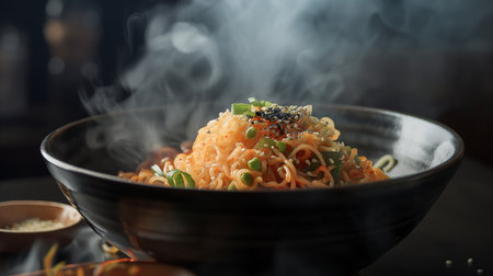 A beautifully styled steaming bowl of spicy noodles, topped with fresh herbs and colorful vegetables, capturing the essence of delicious cuisine.